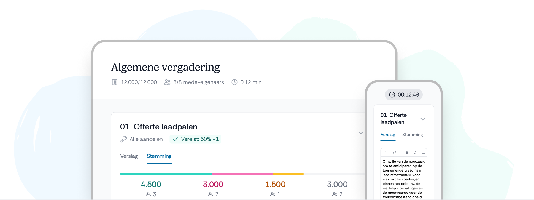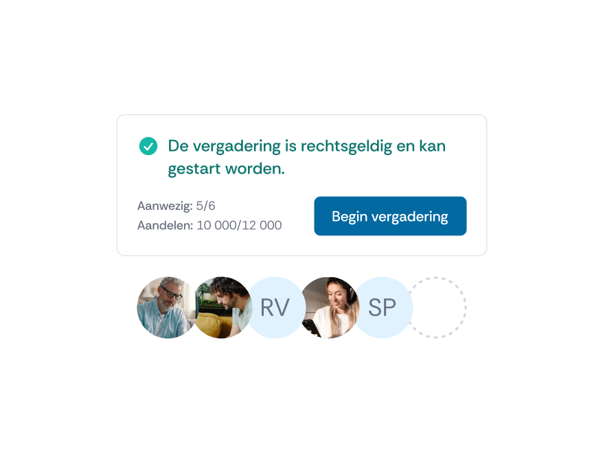 Beheer volmachten en garandeer een correcte stemming. Het platform berekent automatisch het quorum en telt elke stem volgens de juiste aandelen, voor een rechtsgeldige uitslag.
