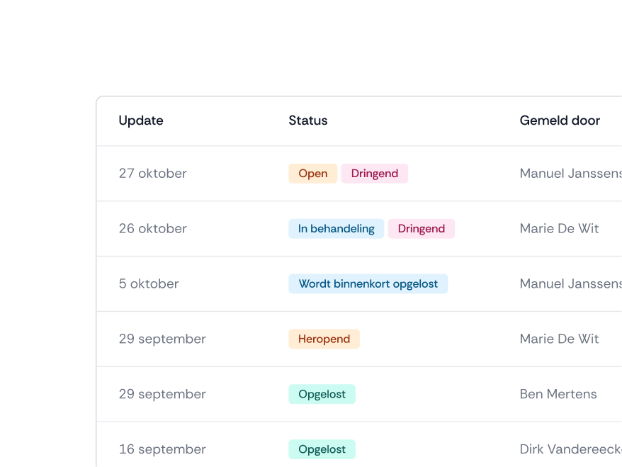 Een mede-eigenaar meldt een probleem of stelt een vraag in het platform. Je koppelt er vlot een status, prioriteit en indien nodig een taak aan. Zo raakt geen enkel probleem ondergesneeuwd.
